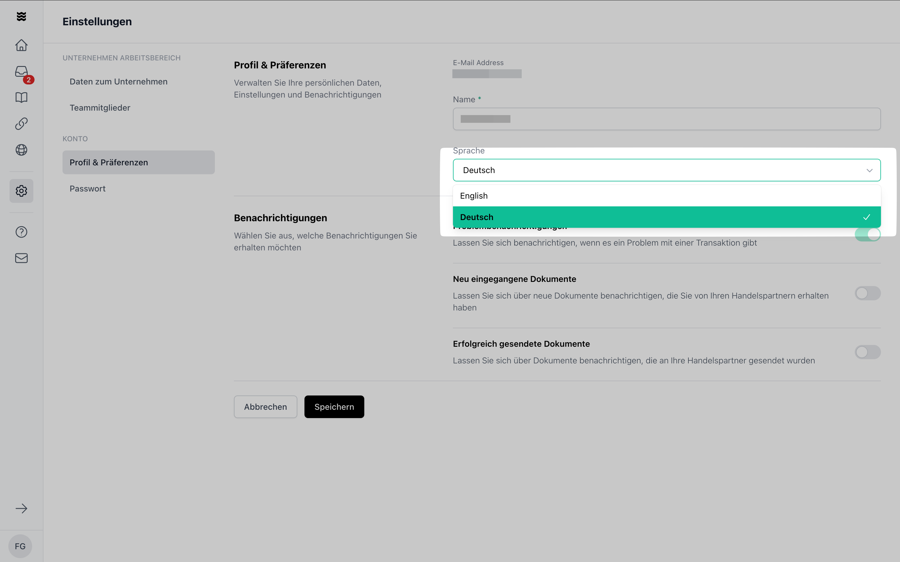 Wählen Sie Ihre bevorzugte Sprache aus dem Dropdown-Menü. Aktuell stehen Deutsch und Englisch zur Verfügung.