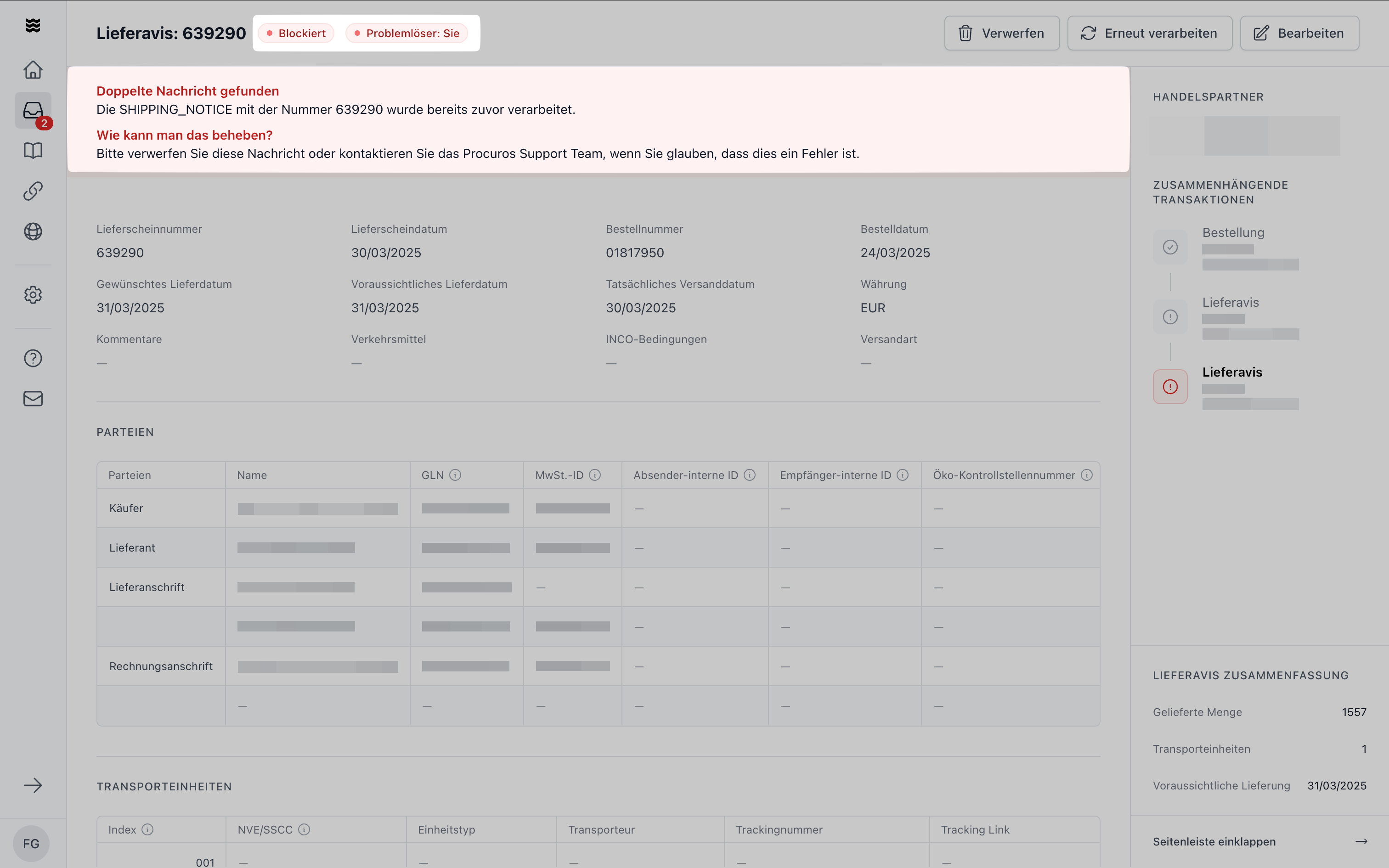 Wenn Sie eine Transaktion bereits manuell in Ihr System importiert haben, sollten Sie diese in Procuros über “Transaktion verwerfen” mit Angabe eines Grundes aus der Übersicht entfernen, um zu verhindern, dass sie weiterhin als blockiert angezeigt wird.