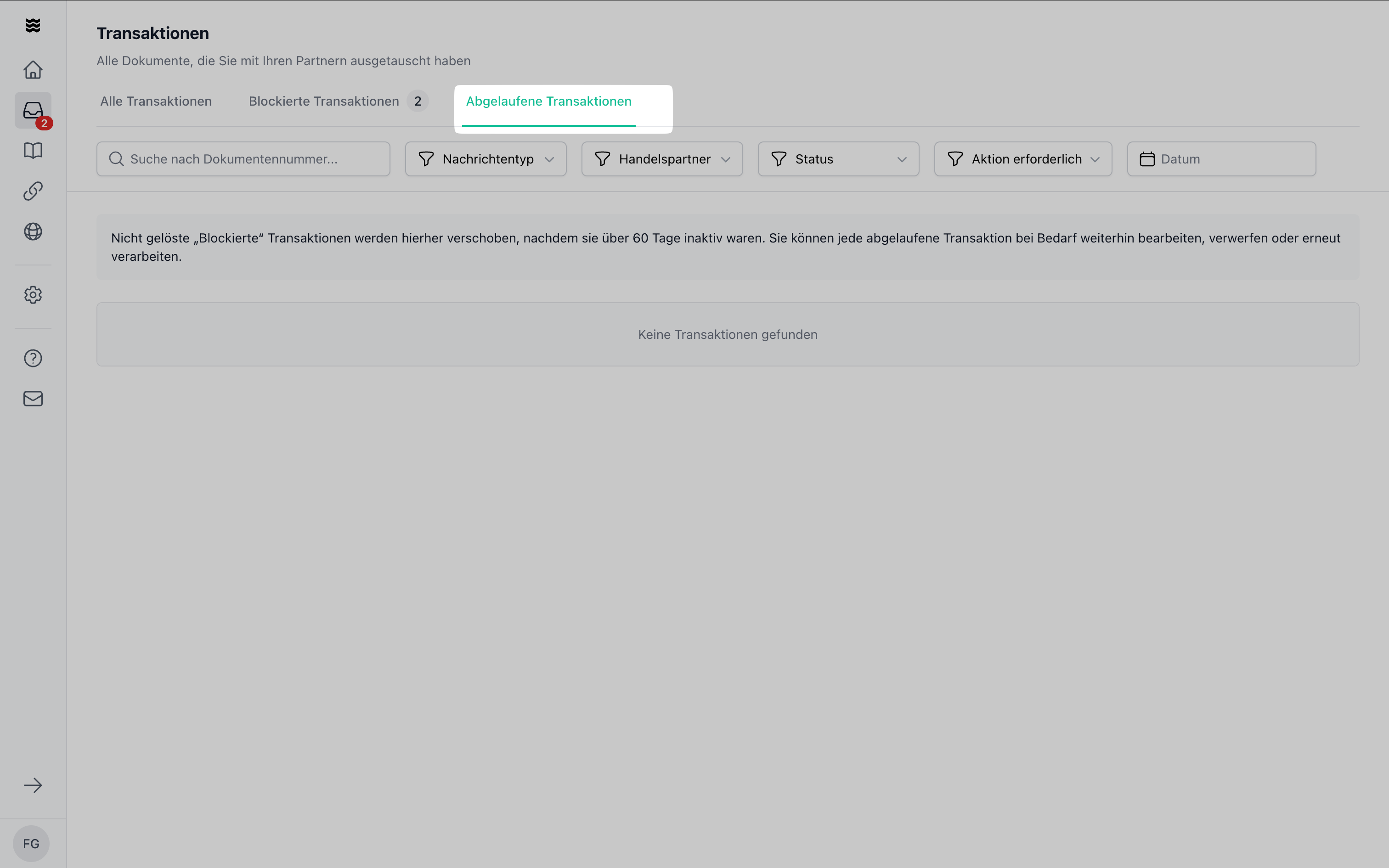 Transaktionen, die länger als 60 Tage blockiert sind, werden automatisch in den Tab “Abgelaufene Transaktionen” verschoben. Dies gewährleistet eine übersichtliche Darstellung aktueller Probleme und verhindert, dass die Hauptübersicht überladen wird. Abgelaufene Transaktionen bleiben vollständig bearbeitbar und werden genauso behandelt wie blockierte Transaktionen.1